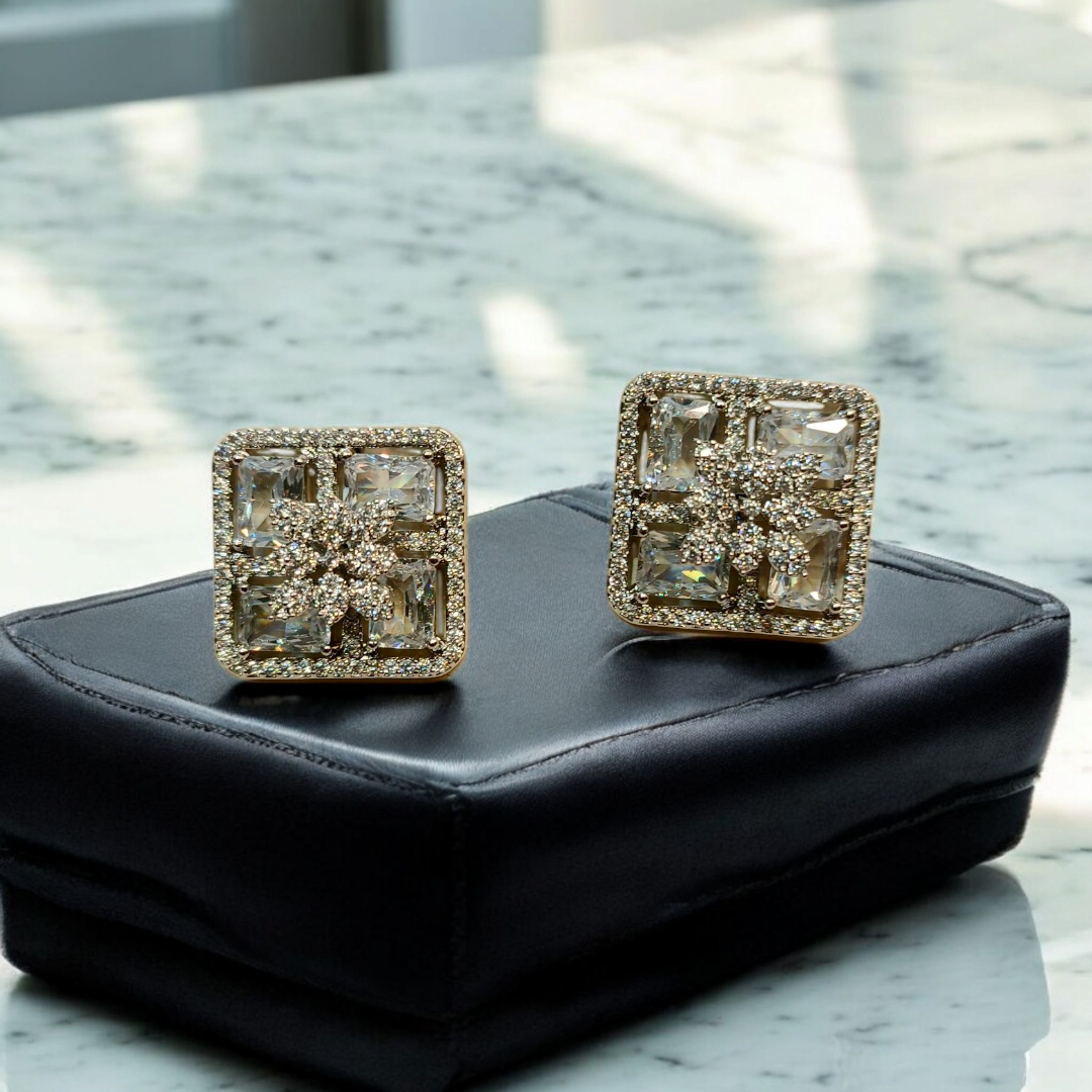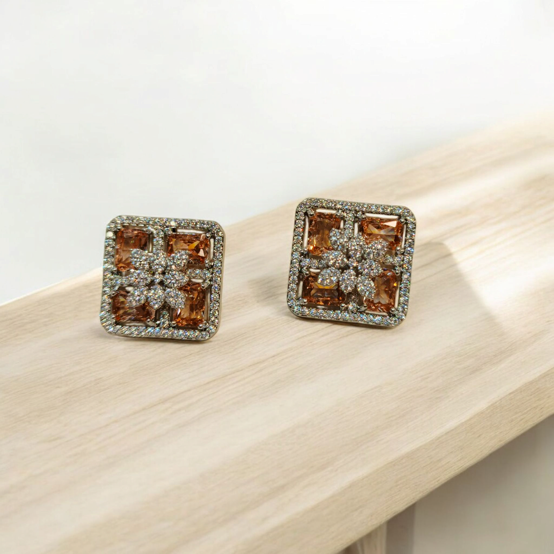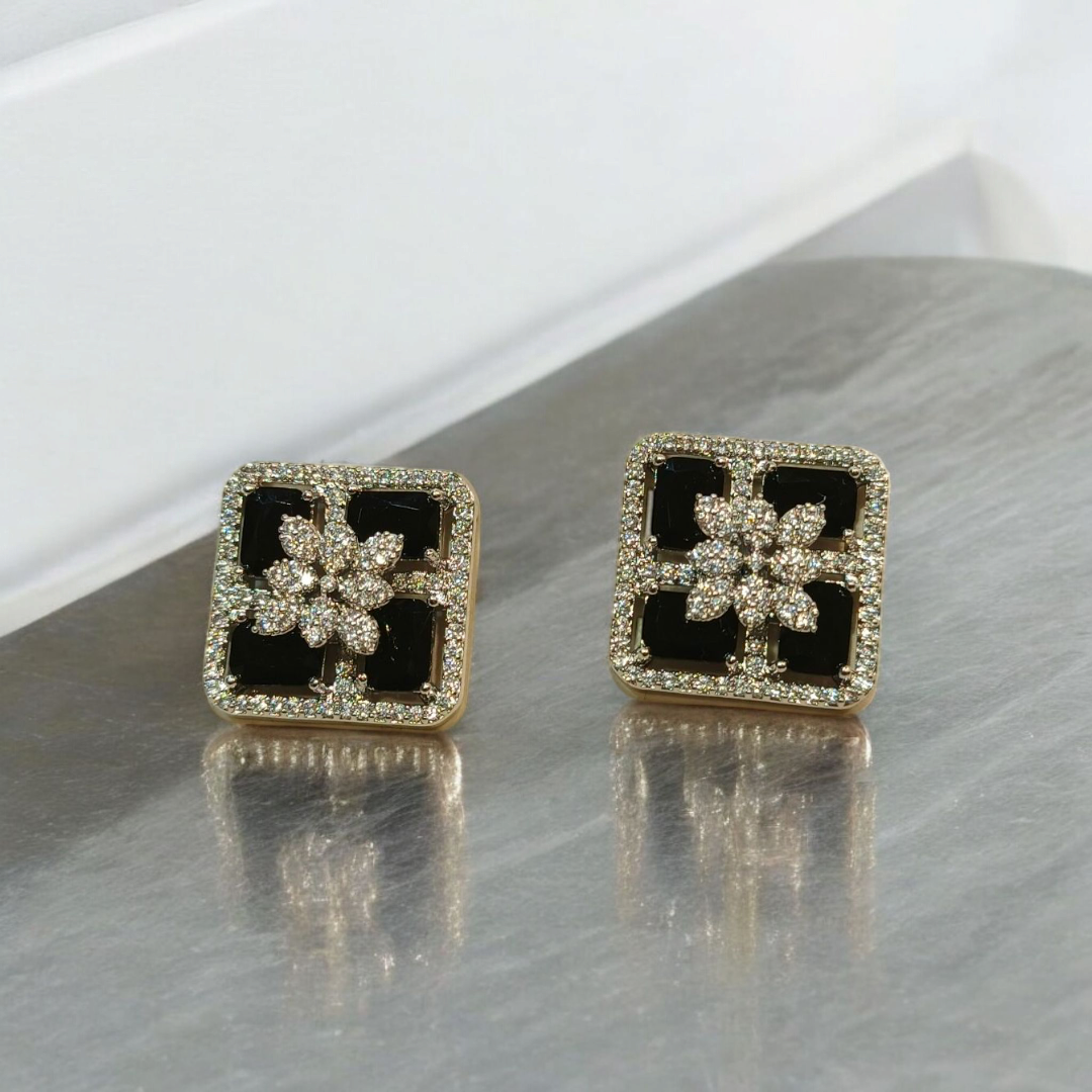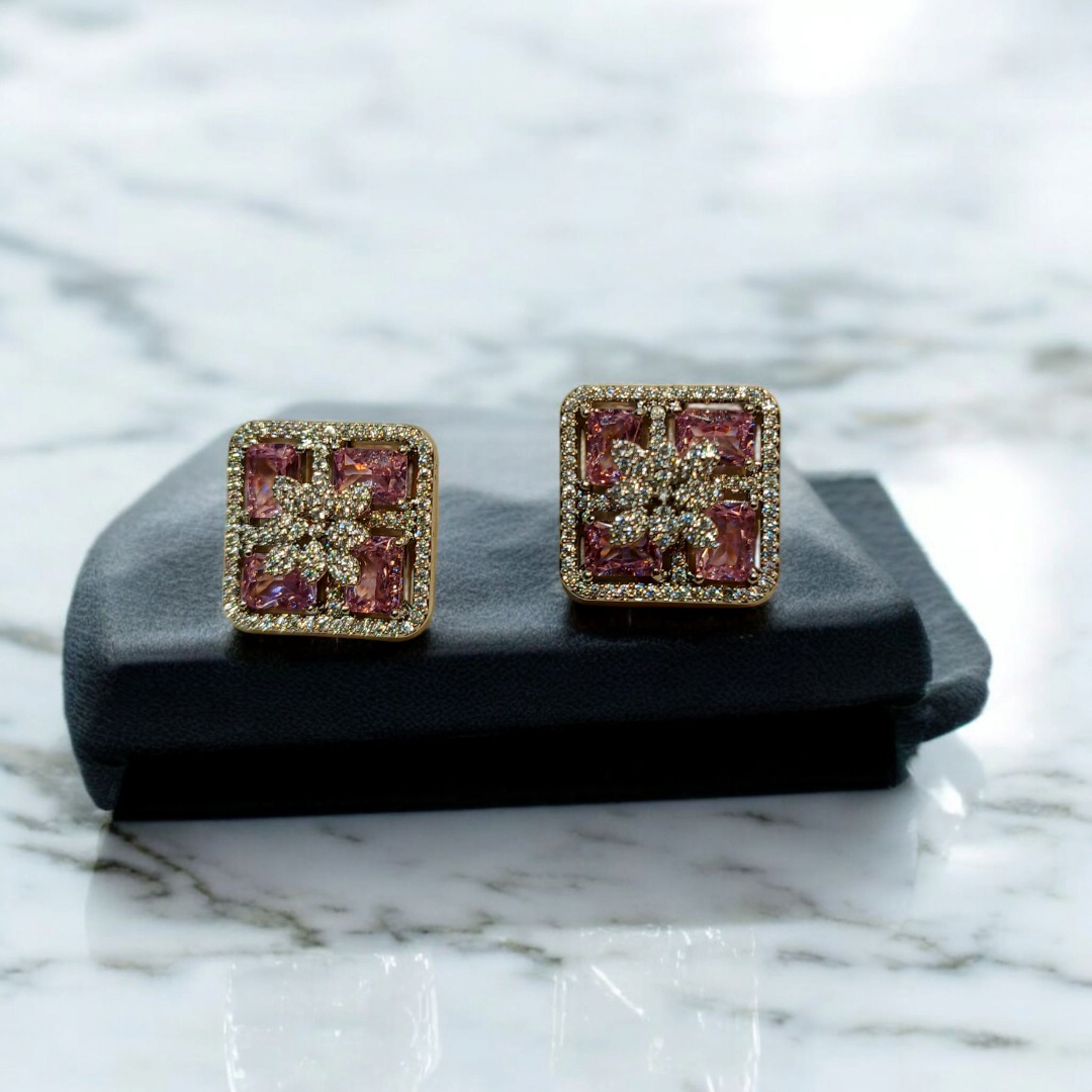 Elevate your look with our latest Square Floral Studs. Featuring a delicate flower motif at the center, surrounded by vibrant, high-quality stones,​Available in a spectrum of royal shades:​